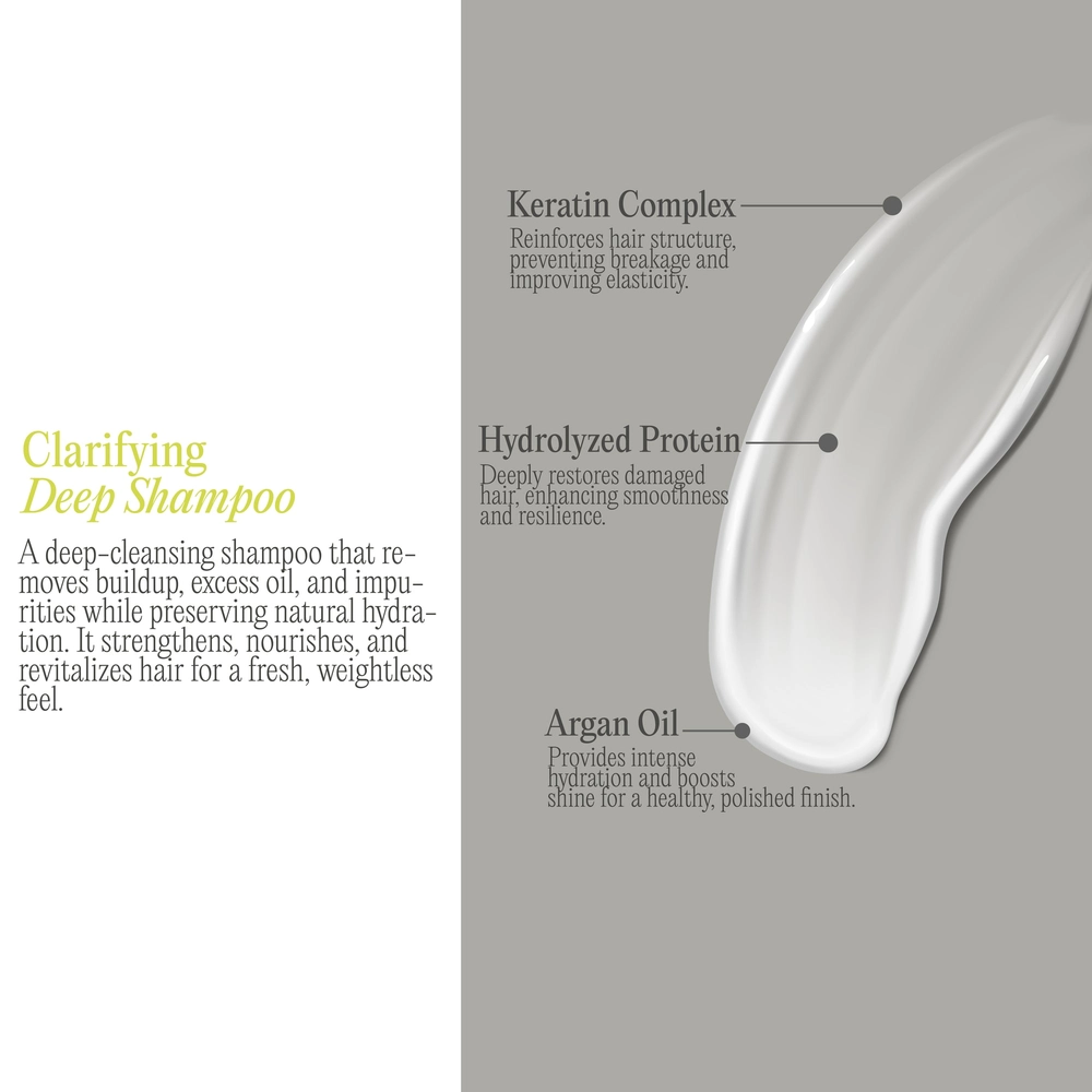 A deep-cleansing shampoo formulated with keratin, hydrolyzed proteins, argan oil, and fruit extracts. It effectively removes build-up and impurities, leaving hair refreshed and revitalized.